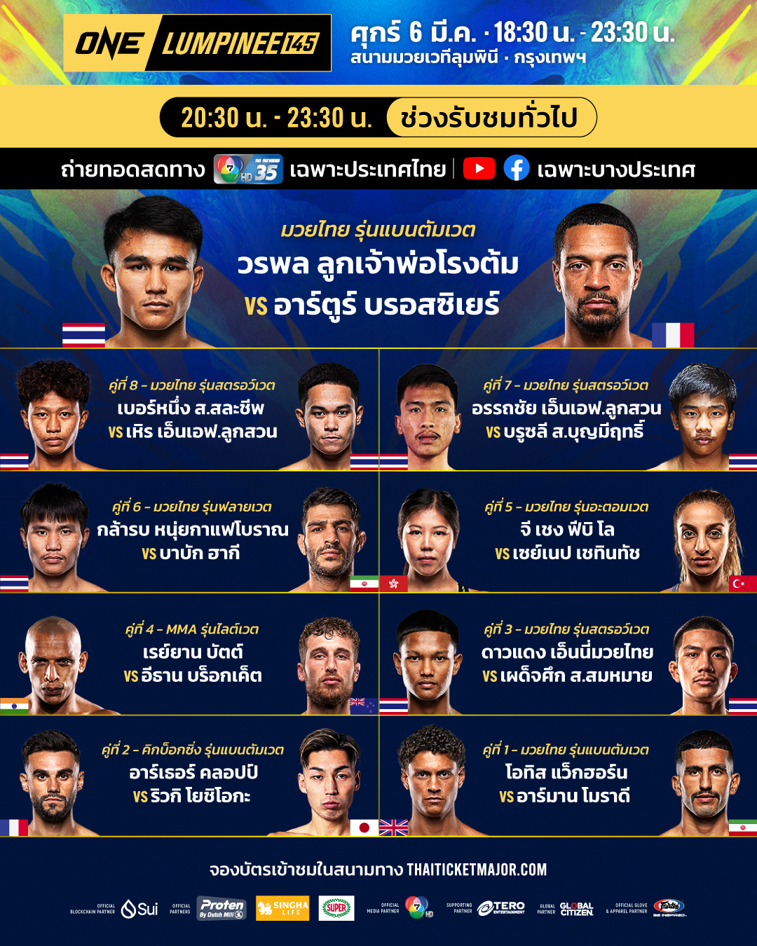 ศึก ONE Lumpinee 145 มีการจัดโปรแกรมการชกหลายคู่ ทั้งในกติกามวยไทยและเอ็มเอ็มเอ โดยมีนักชกดาวรุ่งและนักสู้มากประสบการณ์ขึ้นสังเวียน เพื่อชิงชัยและสร้างผลงานบนเวทีระดับนานาชาติ 📍